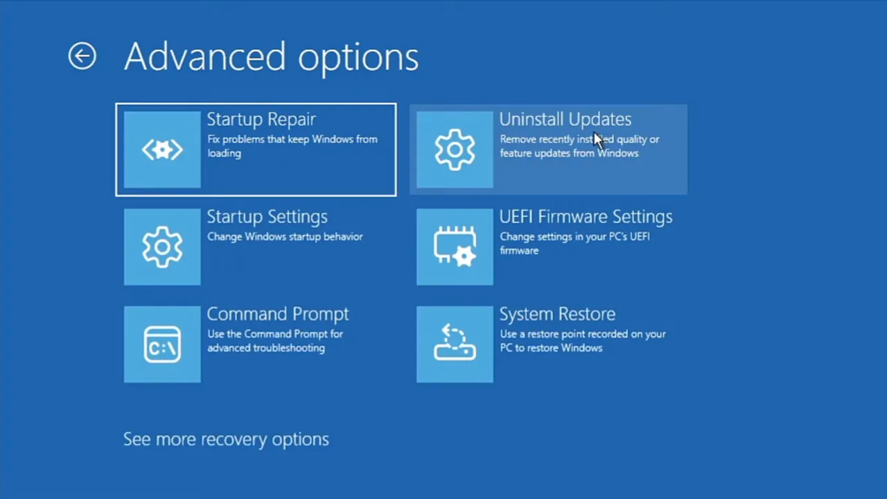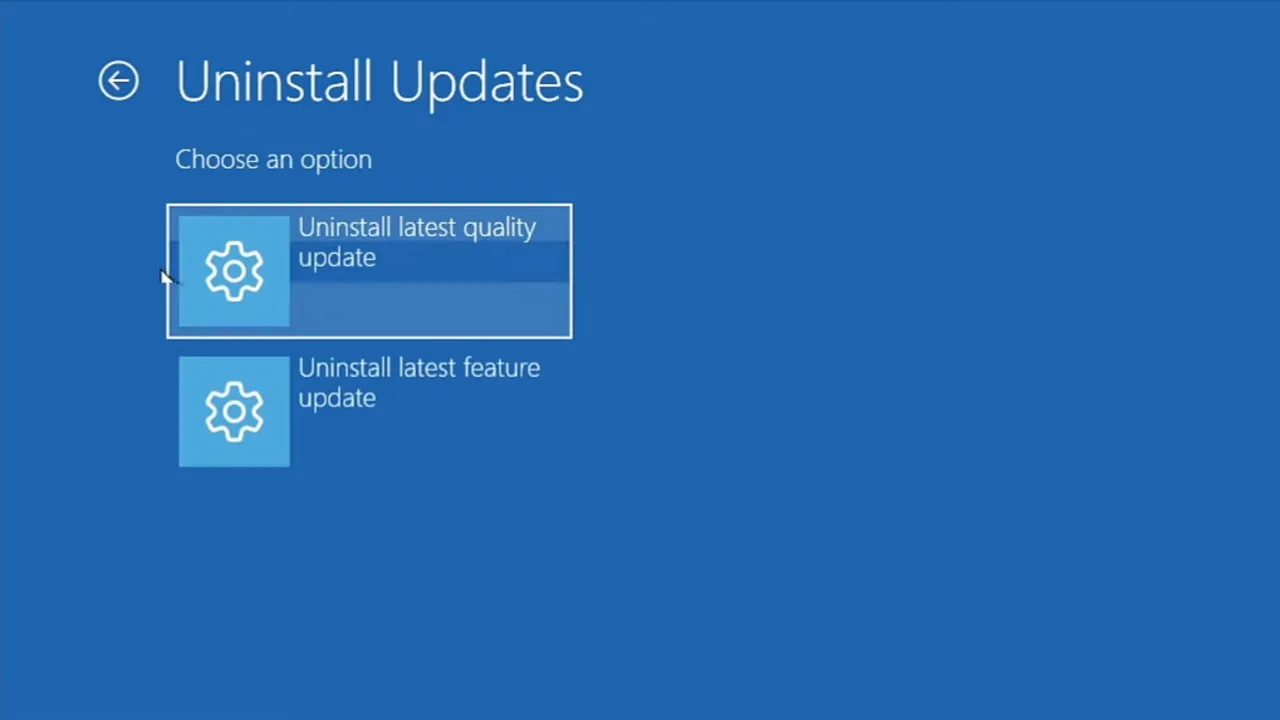 If the black screen appeared immediately after a Windows update, rolling back that update is the most targeted fix. Updates sometimes break display drivers or boot processes. In Recovery Environment, go to Troubleshoot > Advanced Options > Uninstall Updates. Choose “Uninstall latest quality update“, restart, and check the display.